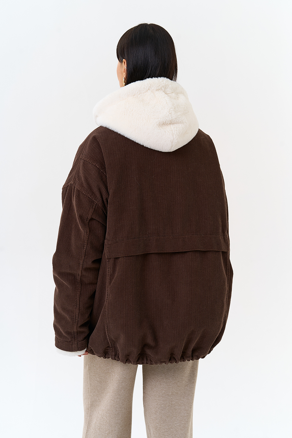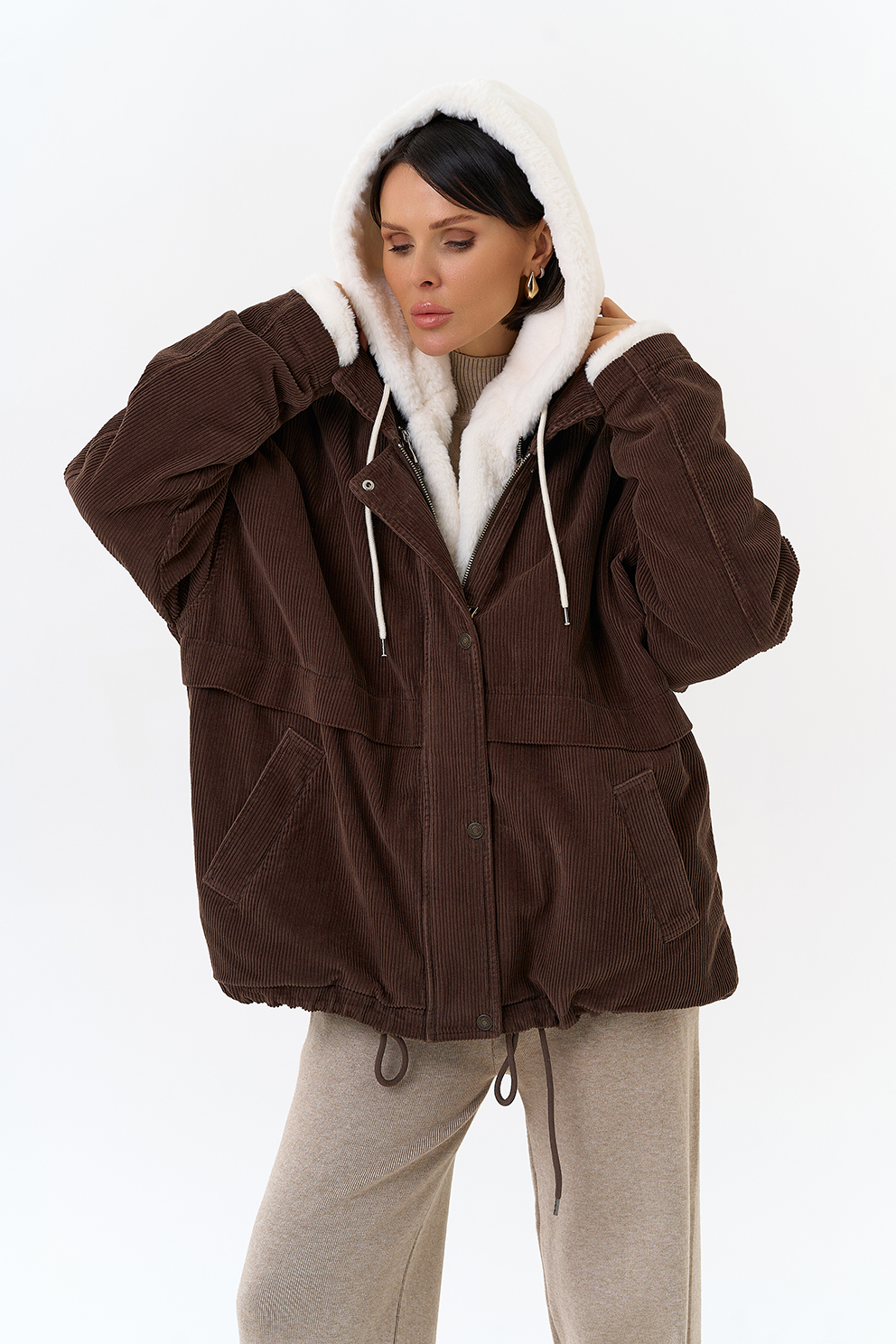 Крой воротника - съемный капюшон, отделка эко мех